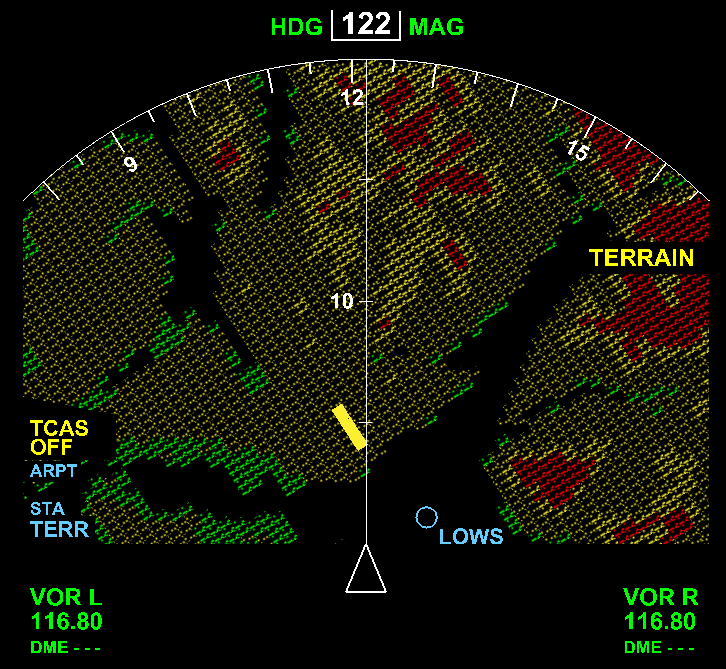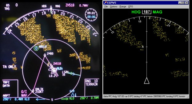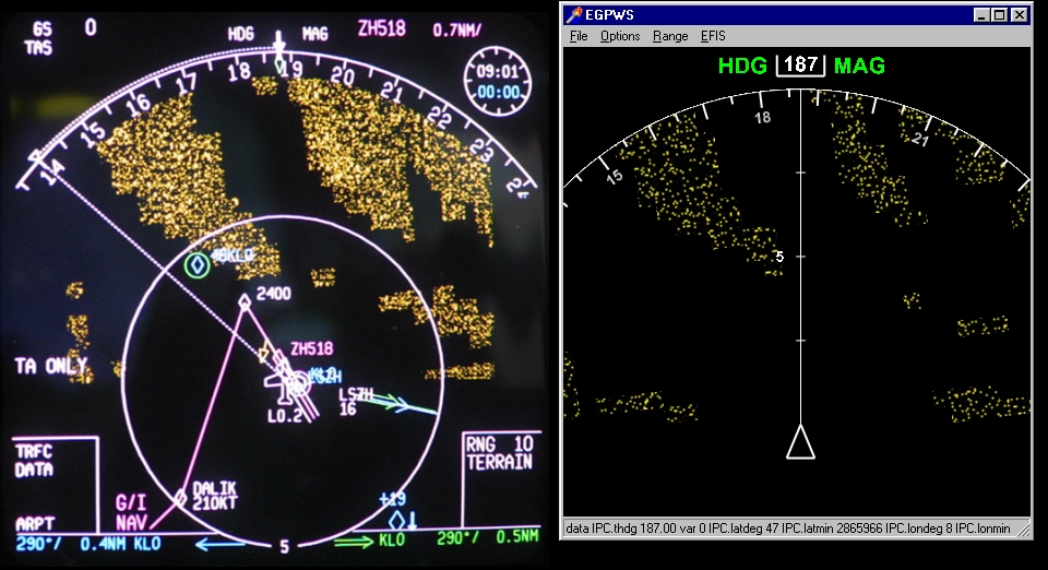 (left) EGPWS terrain data as seen on a MD-11 aircraft departing LSZH (Zurich).