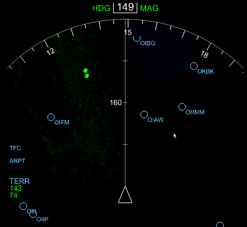 Left: Flying over Iran southbound towards to Persian Gulf. The 'Peaks Mode' display of EGPWS