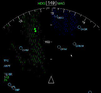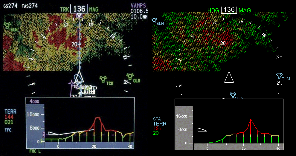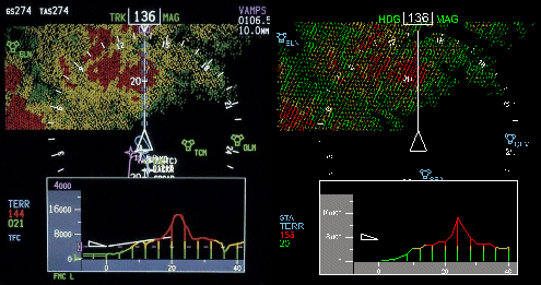 (left) Peaks Mode enhanced EGPWS Terrain Elevation Data display of a B747-400