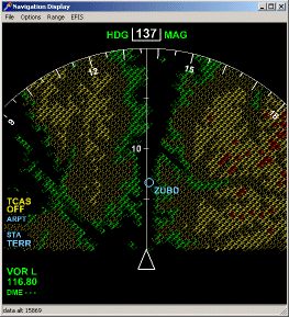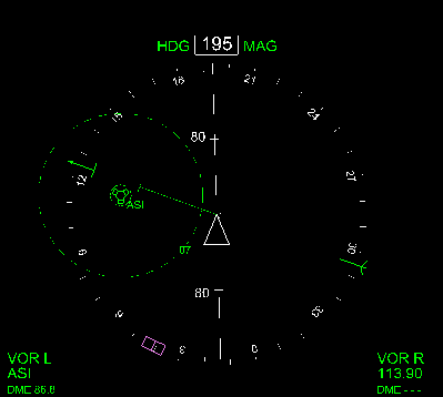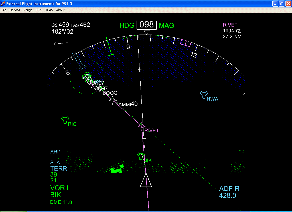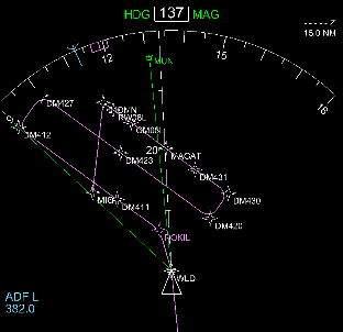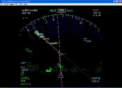 and the VOR and NDB needles are alive. The wind speed and direction as well as the FMC route