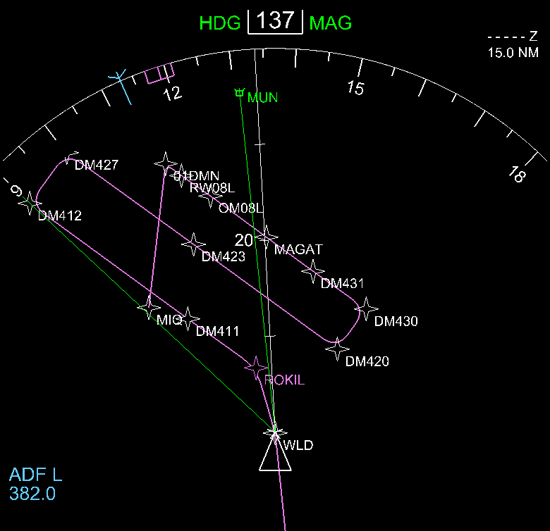 Left: LNAV/FMC route display. Approach Munich from the North-West with ROKIL26 approach